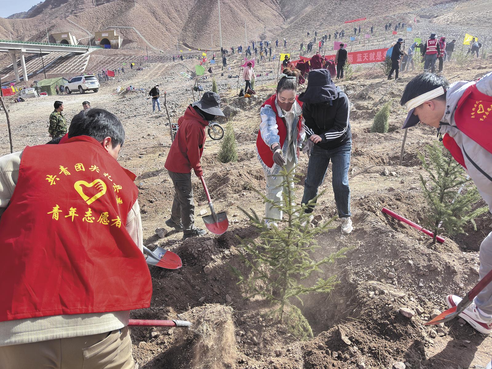 青年志愿者踊跃参与植树。尖扎县委宣传部供图