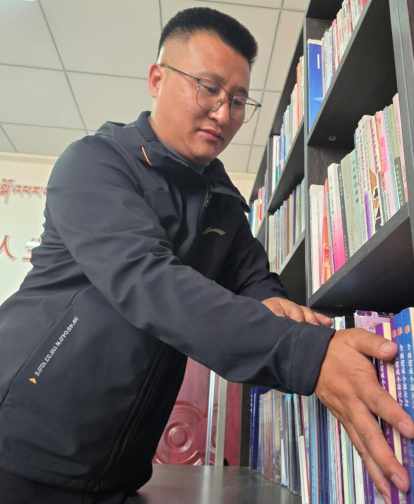 4月14日,多杰扬本在整理书架。新华社记者 李琳海 摄