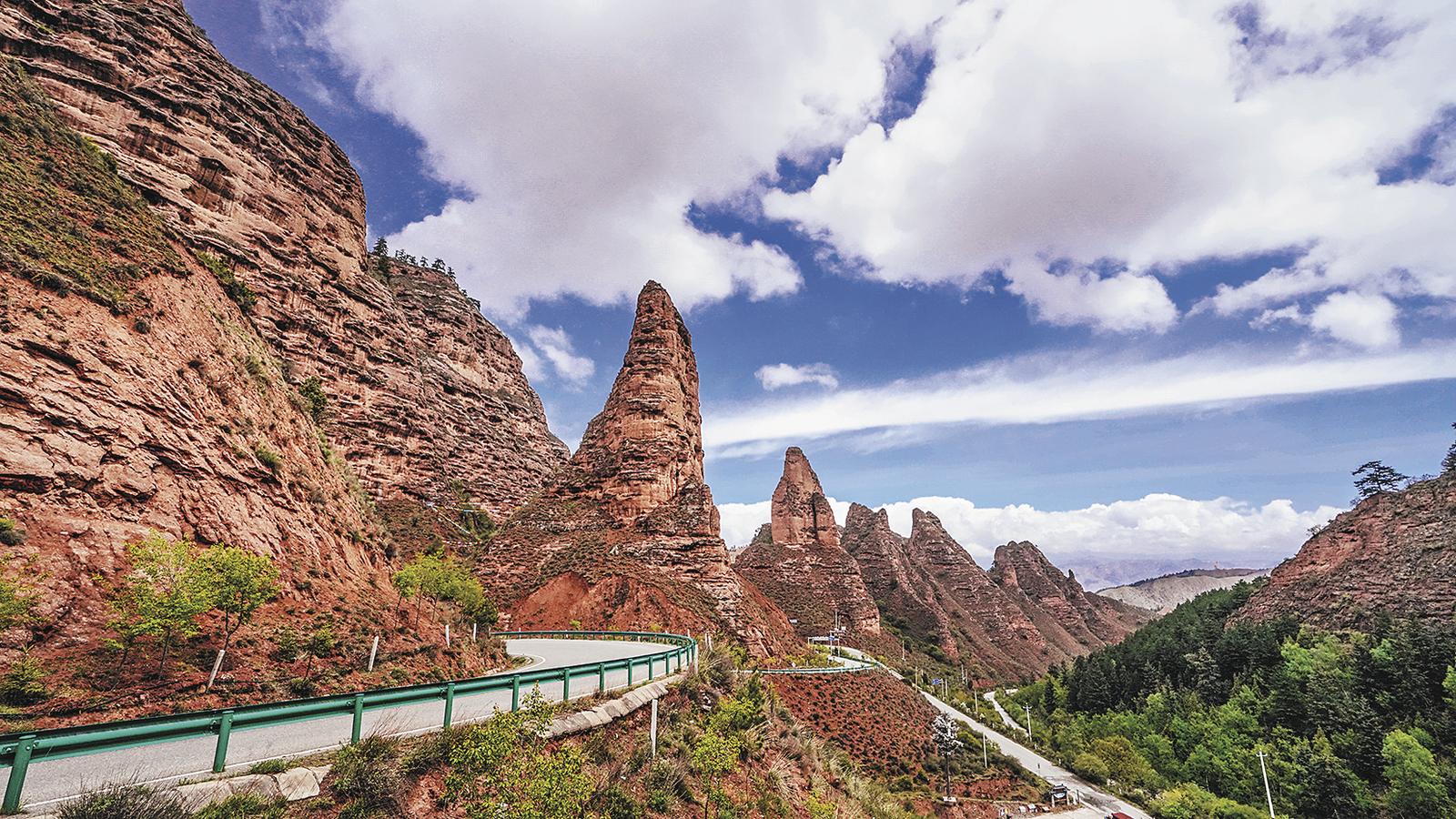春风轻拂,赤红山脊在晨光中熠熠生辉,丹霞地貌的沟壑间仿佛镶嵌着点点碎金。黄河在丹霞群峰间蜿蜒流淌,如一条翡翠绸带。高原云杉在崖缝间挺立,枝头簇拥,迎接晨曦。