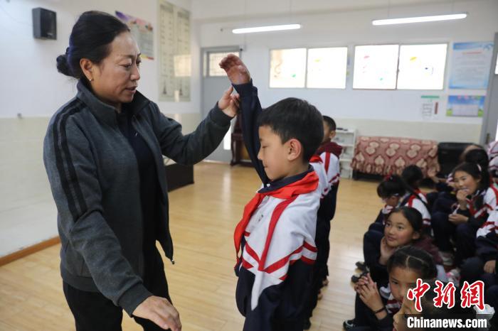 图为音乐老师胡嗣梅指导一名合唱团成员练习巴塘弦子舞动作。中新社记者 王磊 摄