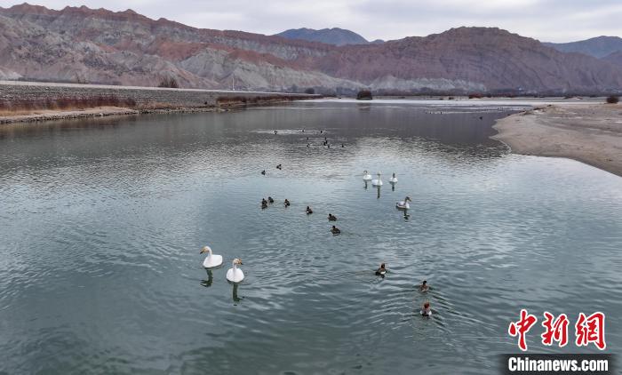 2月27日,在青海省海南藏族自治州贵德县境内,越冬候鸟与丹霞地貌相映成趣。(无人机照片) 中新社记者 马铭言 摄