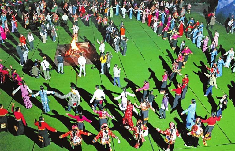 “簪花之路”沿线的锅庄舞表演吸引众多游人参与。