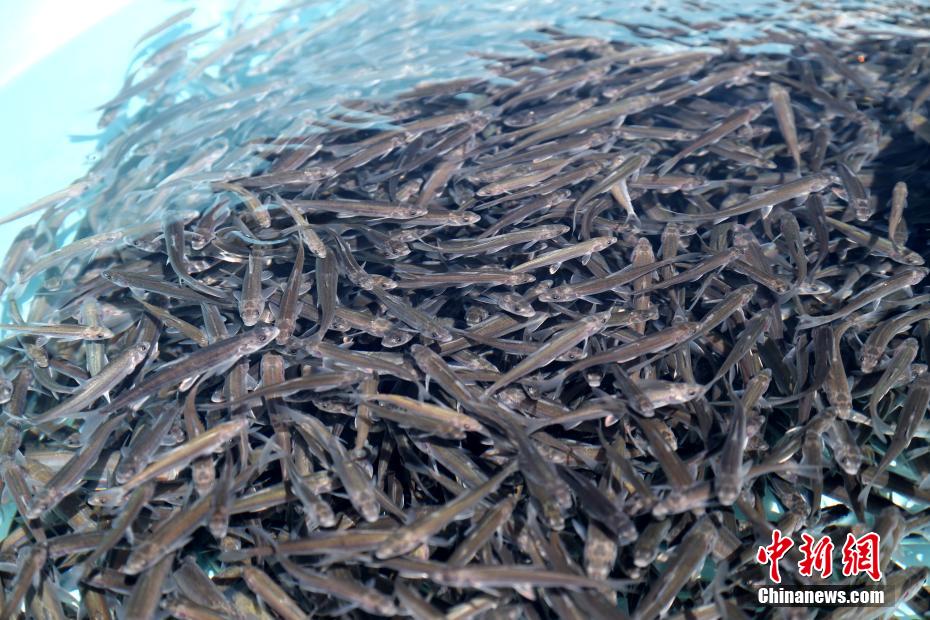 图为工作人员检查裸鲤鱼苗。(无人机照片)张忠苹 摄