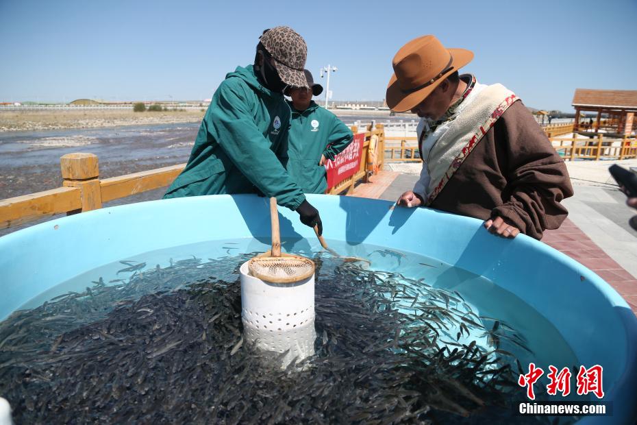 6月11日,青海省海北藏族自治州刚察县举办第十七届青海湖裸鲤增殖放流暨观鱼季活动。民众将100万尾青海湖裸鲤鱼苗放流至青海湖入湖河之一的沙柳河中。