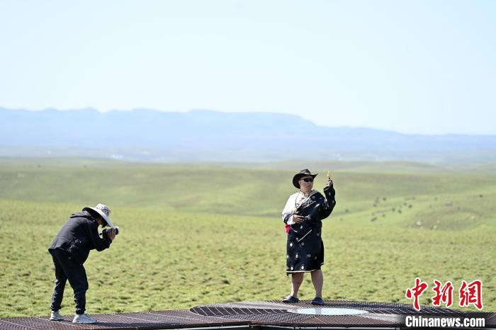 图为在美仁大草原观景台上,游客体验藏装拍摄。九美旦增 摄