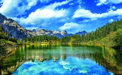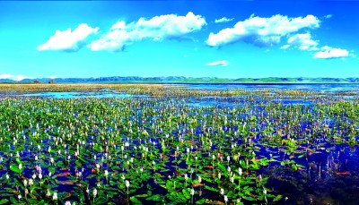 蓝天白云下的甘南骨麻湖,四周环绕着原始森林和高山草甸。钟建龙 摄