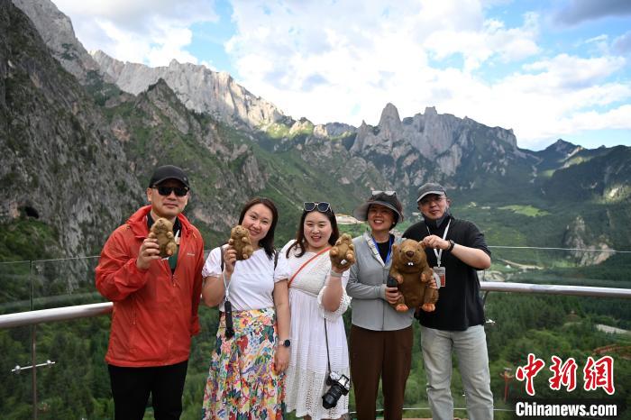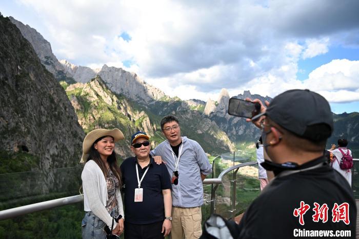 图为采访团成员在扎尕那景区达日观景台拍照留念。中新社记者 九美旦增 摄