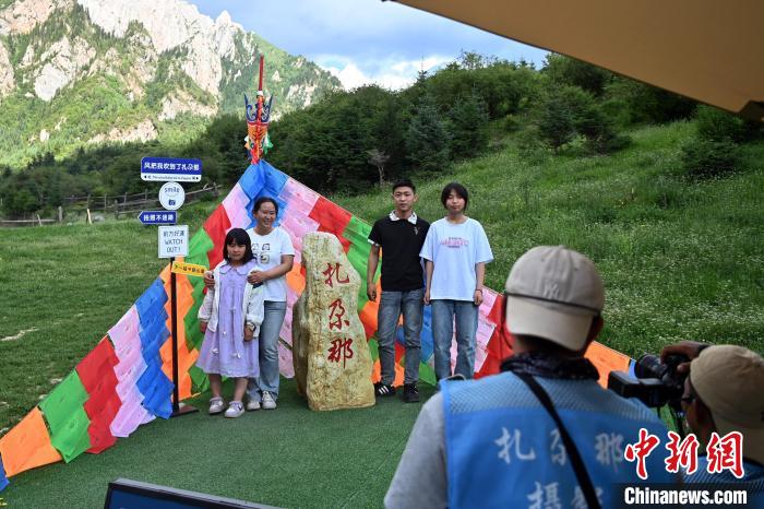 图为游客在扎尕那景区拍照游览。中新社记者 九美旦增 摄