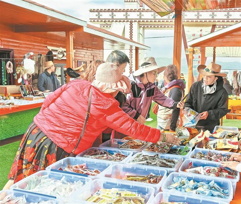在祁华锦秀峨堡古城驿站内游客在挑选牦牛肉干。丁玉梅 摄