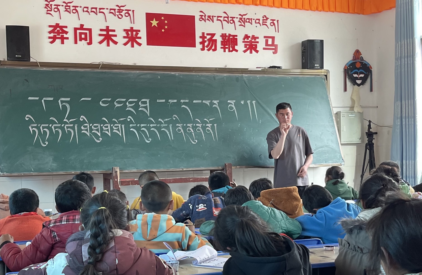 登真益尼教学生拼写藏语字母。