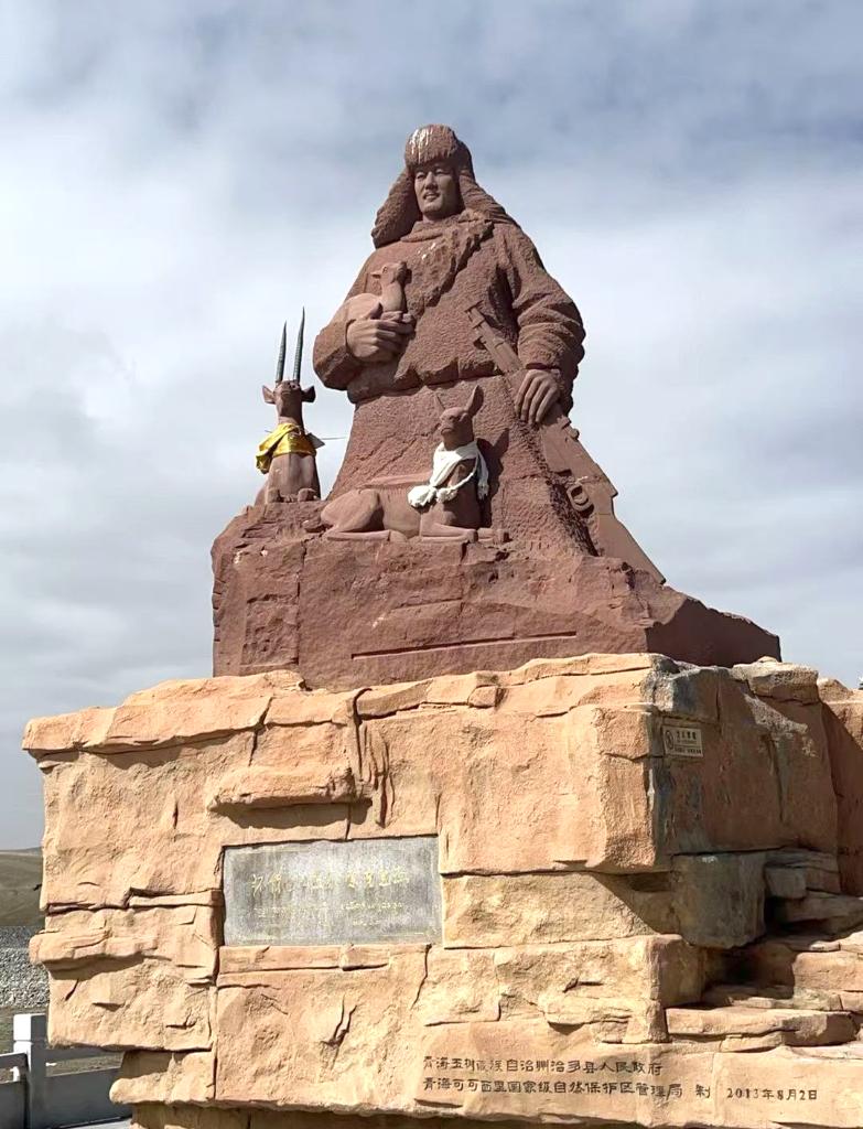 昆仑山口,索南达杰纪念碑静静矗立。纪念碑旁砂红色的雕像,高大而肃穆。我们下车,向这位因守护可可西里藏羚羊而牺牲的英雄鞠躬致敬。