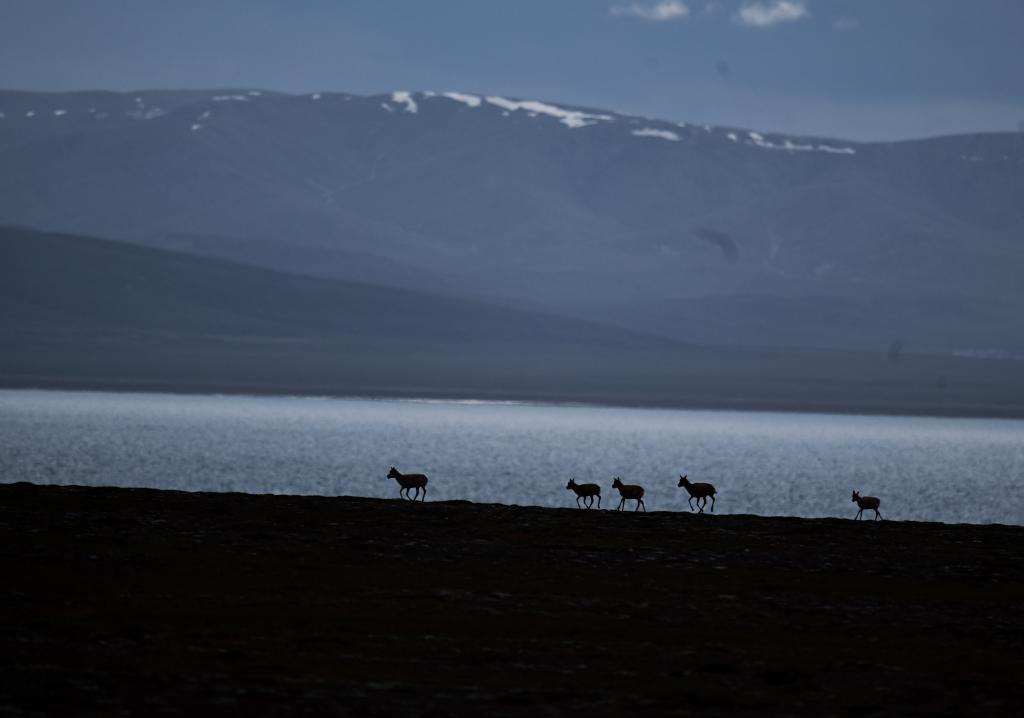 在可可西里卓乃湖区域,几只藏羚羊在活动。 新华社记者 张龙 摄