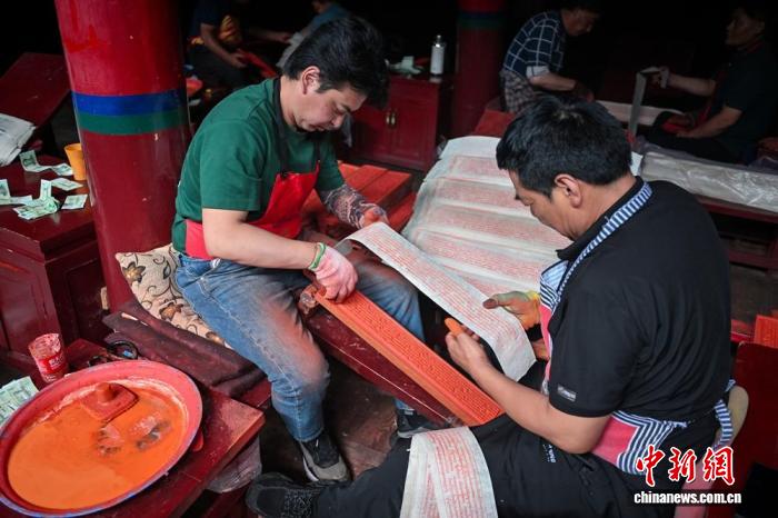 在藏版库旁的印刷工坊里,10多名工匠正在忙碌。部分工匠手持墨刷,在《丹珠尔》印版上均匀涂墨,另一部分工匠不停翻转印刷纸张或换新纸。“跟着老工匠们学了几十年,从选料到印刷,每一步都不能急。”62岁的西绕彭错已在印经院工作41年,他指着桌上用瑞香狼毒草根皮制成的印纸介绍,这种纸要经过泡、煮、捶打等11道工序,“纸的韧性好,放几十年都不会坏,虫不蛀、鼠不咬,老祖宗传下来的法子,错不了。”说话间,西绕彭错已将印纸平整铺在版上,用特制印版轻压,片刻后揭下,一行行隽秀的藏文便清晰呈现。正是这群工匠对传统技艺的坚守,让雕版技艺成为活态的文化遗产。