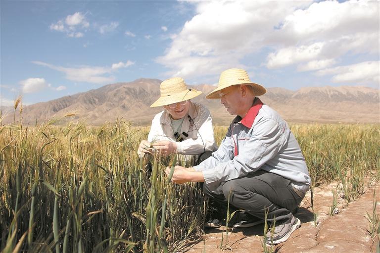 孔祥国与陈大录查看青稞长势。实习记者 朱炜明 摄