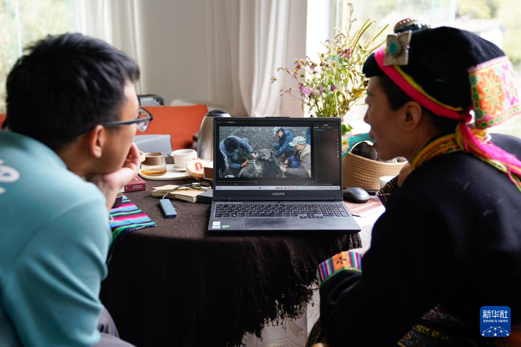 10月8日,能卡曼(右)给在硗碛藏族乡进行调研的研究生卢俊糖展示她拍摄的当地群众剪牦牛毛的视频。新华社记者 胥冰洁 摄