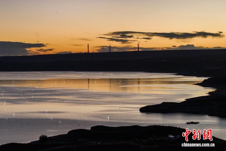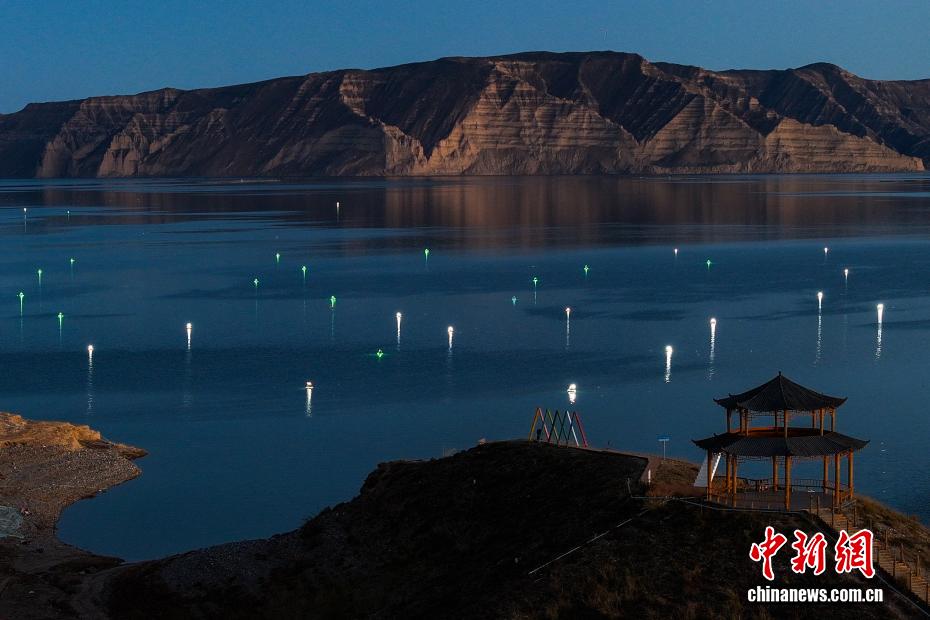 图为航拍九曲里湖面渔灯。(无人机照片)中新社记者 薛蒂 摄