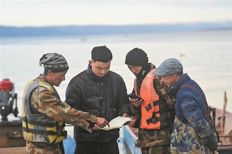 夜幕降临,亮起一盏盏渔灯,铺满湖面,仿佛星星“掉进”龙羊湖,组成了湖面万里星河,成为乡村旅游发展“打卡地”。沈海明驾驶渔船驶入布网区,随着绞盘作响,渔网出水,无数银鳞在灯光中跳跃,一网网的收获变成了渔民们实实在在的收入。渔民们的幸福生活在“下网”与“收网”的渔歌唱晚间迈向更好的明天。