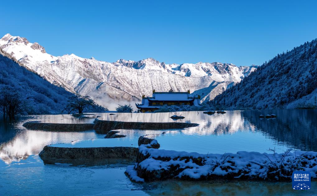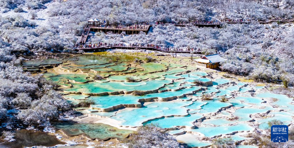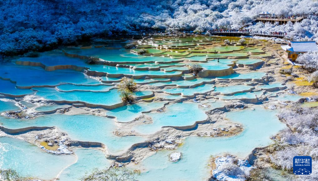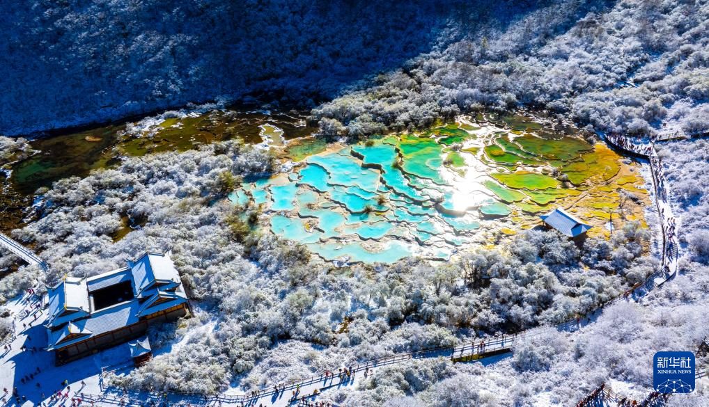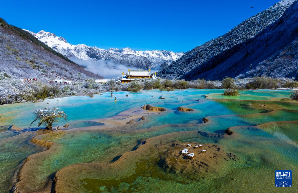 10月21日,四川省阿坝藏族羌族自治州黄龙景区迎来今秋第一场降雪,五彩池与皑皑白雪交相辉映,美不胜收。