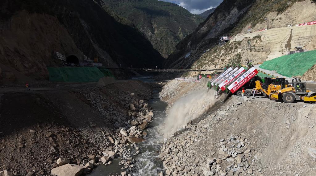 10月28日,自卸卡车协同作业将成吨石料抛投进牙根一级水电站主龙口位置。(雅砻江流域水电开发有限公司供图)