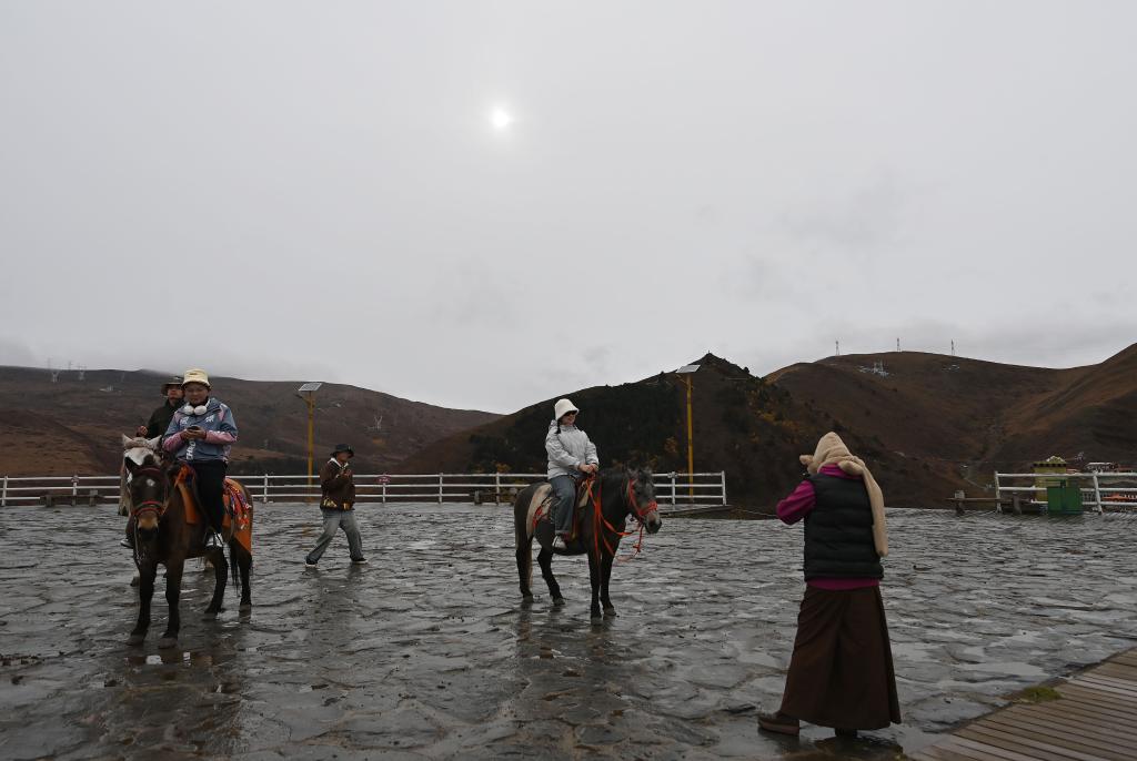 10月31日,游客在四川省甘孜州康定市塔公镇塔公草原景区骑马游玩。新华社记者 肖潇 摄