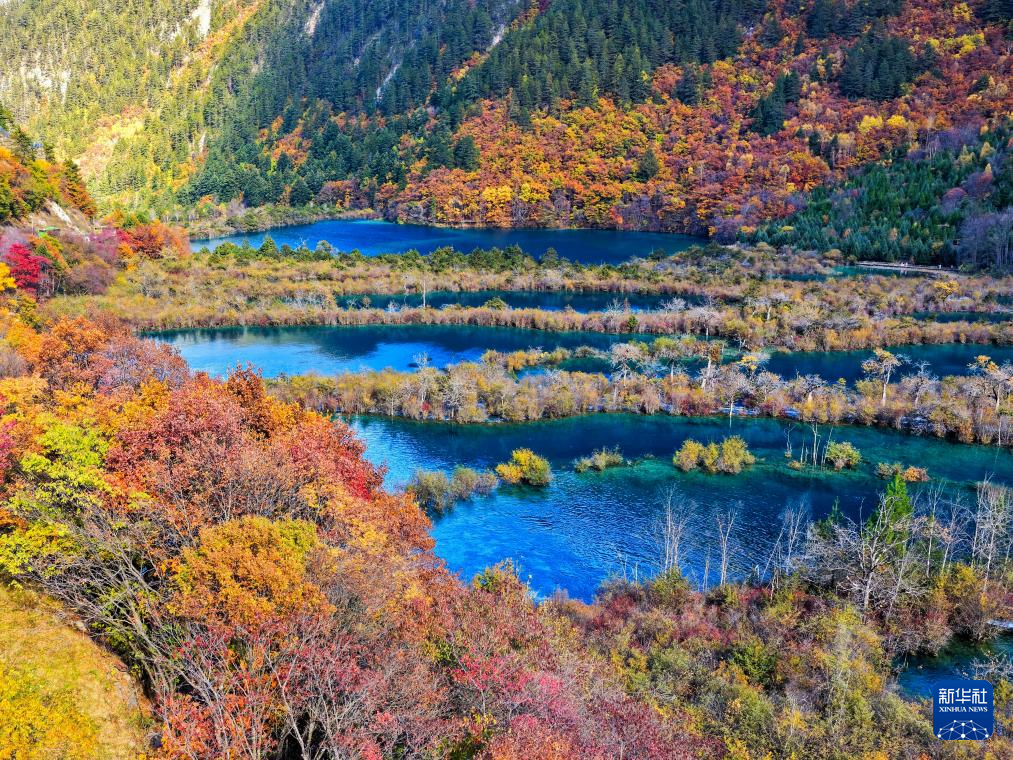 这是2025年11月10日拍摄的九寨沟景区树正群海一景(无人机照片)。新华社发(梁枫摄)