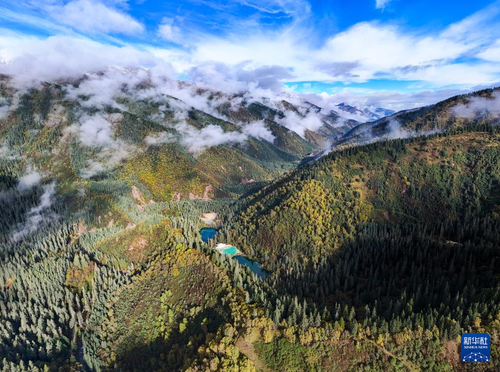 这是2024年10月12日拍摄的九寨沟县神仙池景区内的高原湖泊和钙化池(无人机照片)。新华社记者 王曦 摄