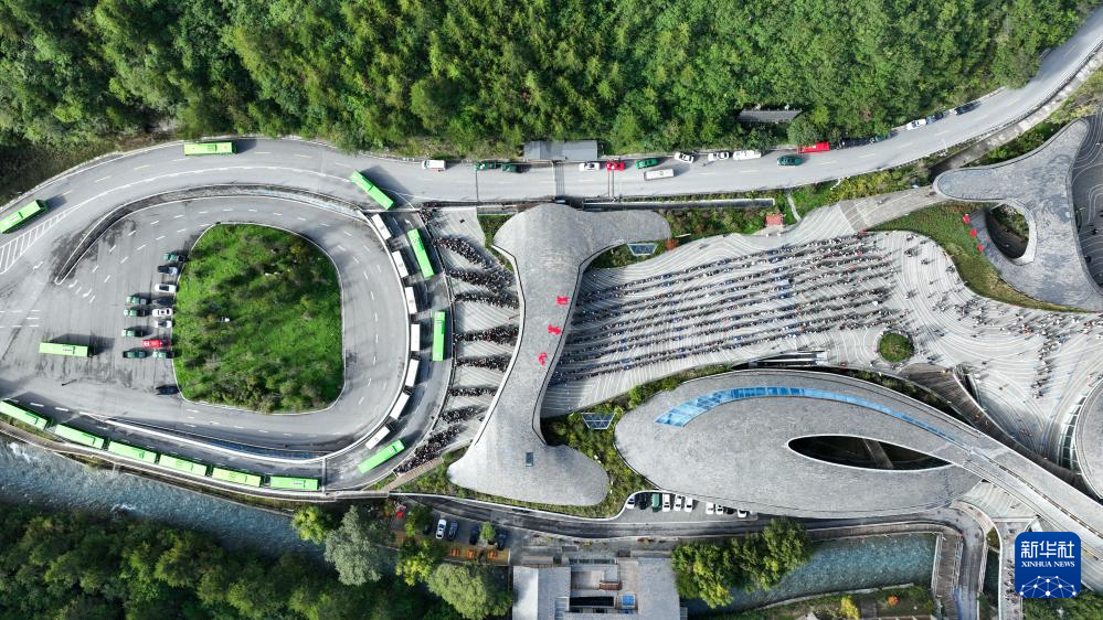 游客排队陆续进入九寨沟景区(2025年10月2日摄,无人机照片)。新华社发(梁枫摄)