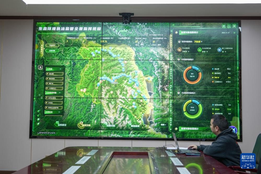 在九寨沟县生态环境局,工作人员在查看生态环境执法监管全景指挥平台(2025年11月17日摄)。新华社发(欧阳慧摄)