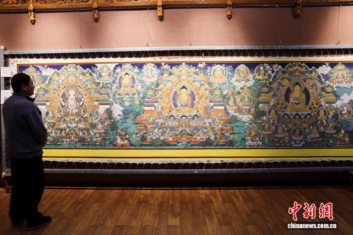 12月10日,青海省黄南藏族自治州同仁市胜境画院内,一名学生观赏唐卡画师夏吾尖措的作品。热贡唐卡源于当地独特的文化生态,被誉为绘画艺术中一面独具韵味的旗帜。如今,许多画师通过系统授徒、开办传习工坊等方式,将调色、勾线、描金等核心技艺传授给年轻一代,让古老技艺得以传承和延续。中新社记者 薛蒂 摄