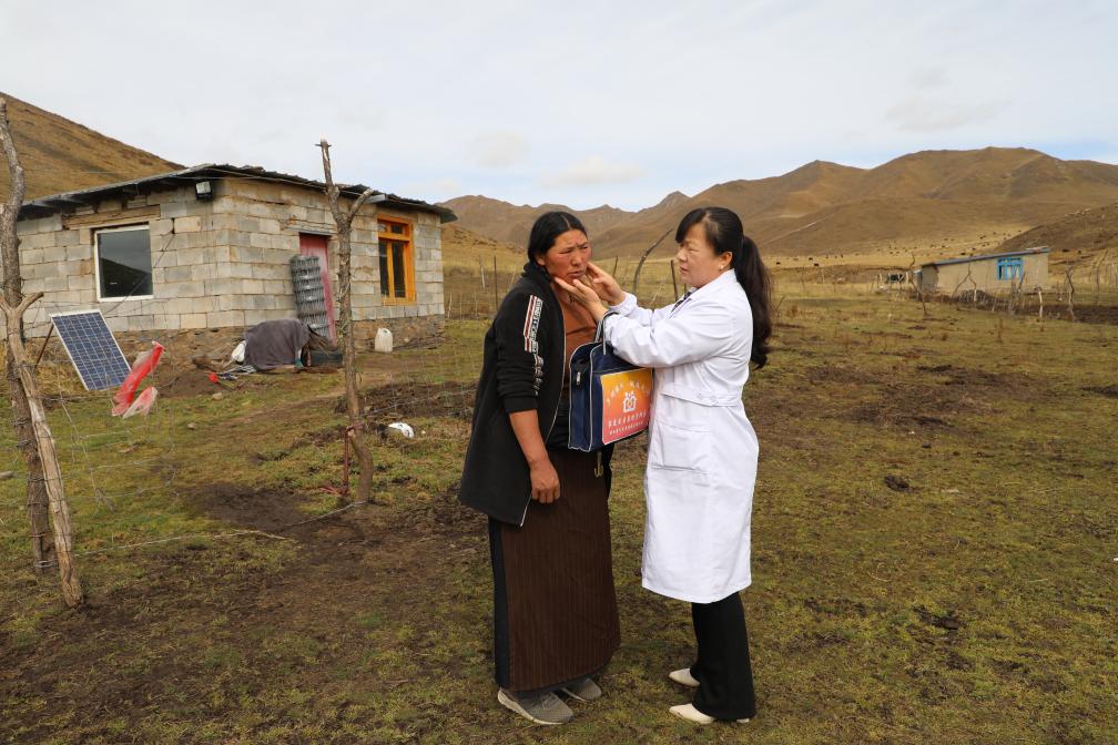 王蒋艳为牧民索南草测量血压。新华社记者 梁军 摄