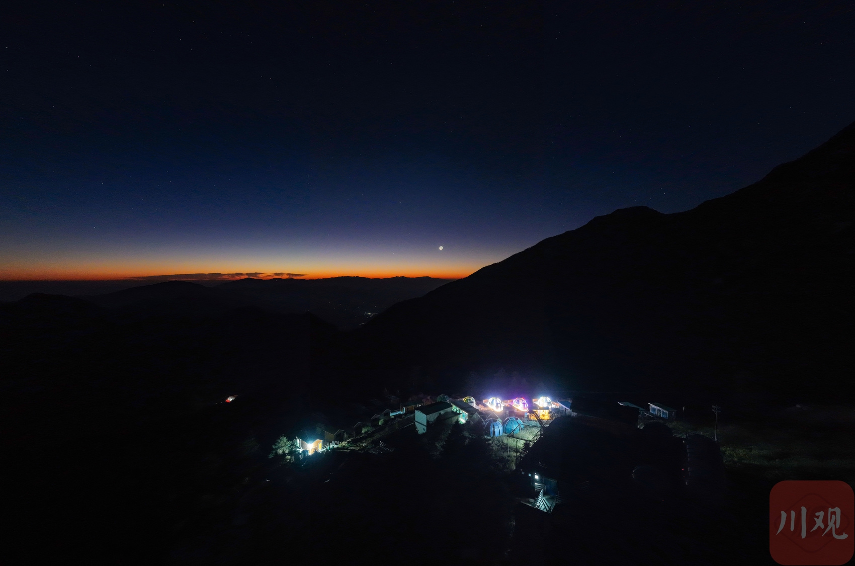 2025年12月18日清晨,四川省甘孜藏族自治州泸定县兴隆镇化林村海拔2080多米的星空房点亮夜空。李向雨 摄