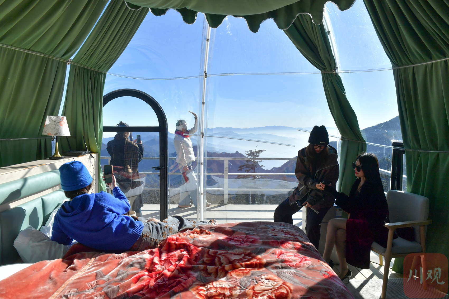 2025年12月18日,游客在四川省甘孜藏族自治州泸定县兴隆镇化林村海拔2080多米的星空房里休闲。李向雨 摄