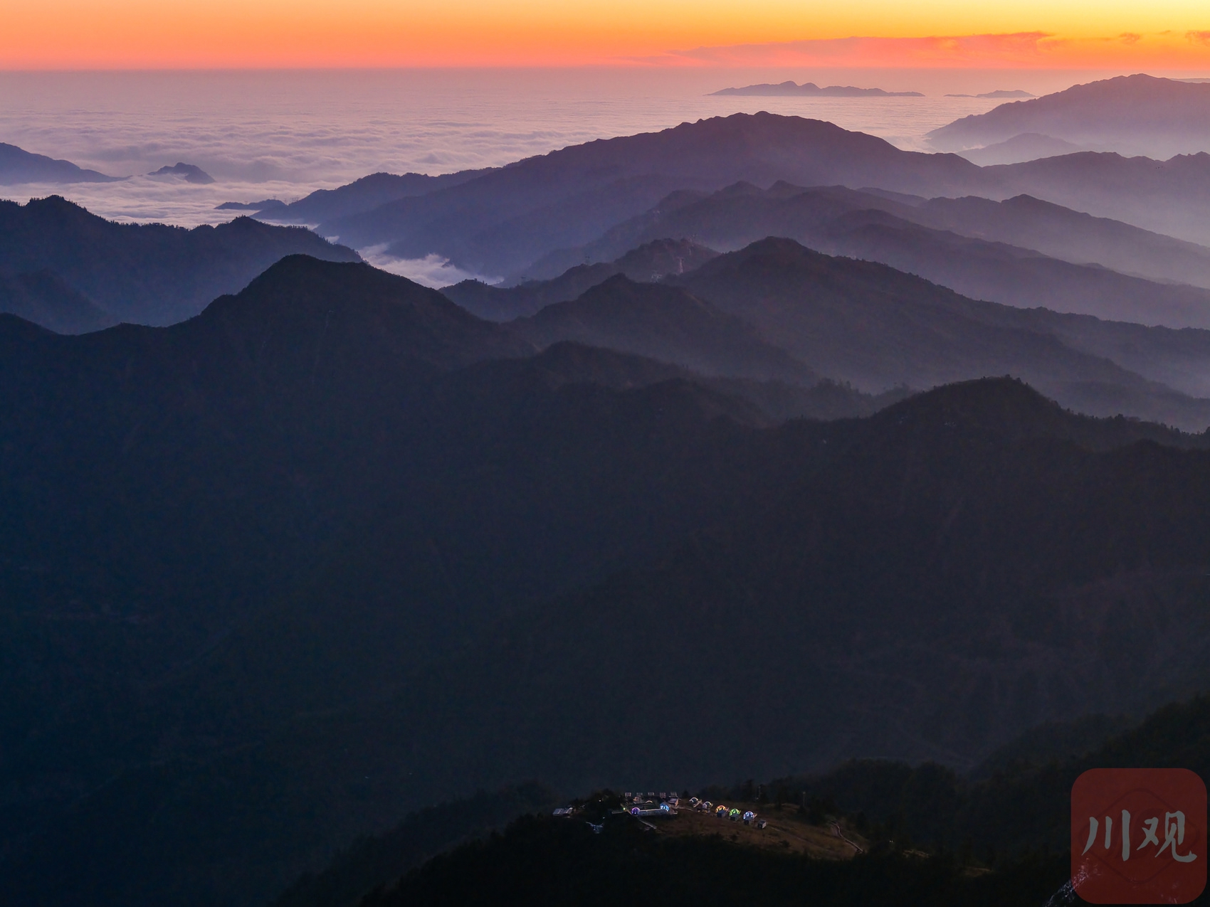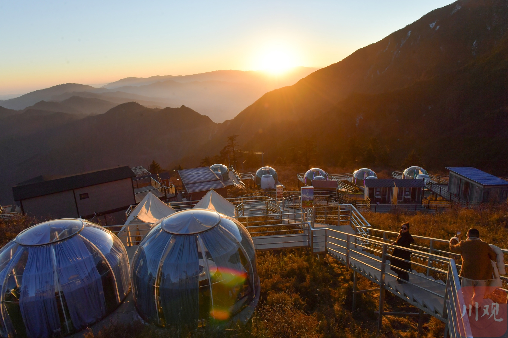 2025年12月18日清晨,游客在四川省甘孜藏族自治州泸定县兴隆镇化林村海拔2080多米的星空房附近拍摄日出。李向雨 摄