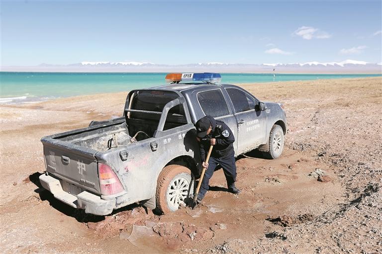 巡护途中,陷车后闹布东周挖车。图片为受访者提供