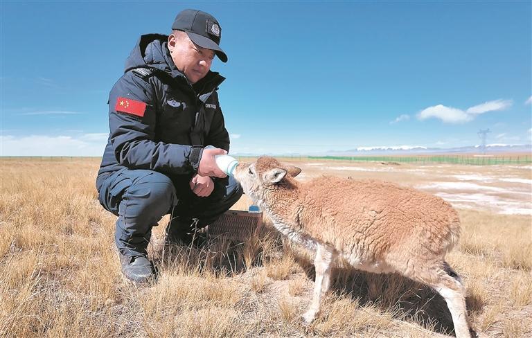 2023年,闹布东周被调往卓乃湖保护站,“我们每天出去巡护,遇到受伤的小藏羚羊或者失去母亲的藏羚羊孤儿,都会小心翼翼地救回保护站。”闹布东周说,刚出生的小藏羚羊身体虚弱,不会用奶嘴喝奶,他们就嘴对嘴的方式喂牛奶。