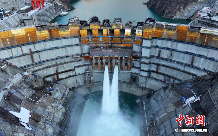 12月27日,中国在建海拔最高双曲拱坝电站——叶巴滩水电站首批机组正式投产发电。叶巴滩水电站位于四川省甘孜州白玉县与西藏自治区贡觉县交界的金沙江干流上。水电站总装机容量224万千瓦,此次首批投产发电的机组为4号和3号机组。图为12月25日,航拍叶巴滩水电站大坝。(无人机照片)