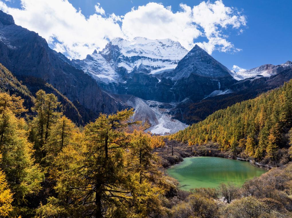 稻城亚丁仙乃日雪山下的湖泊卓玛拉措掩映在彩林中(2025年10月26日摄,无人机照片)。新华社记者江宏景 摄