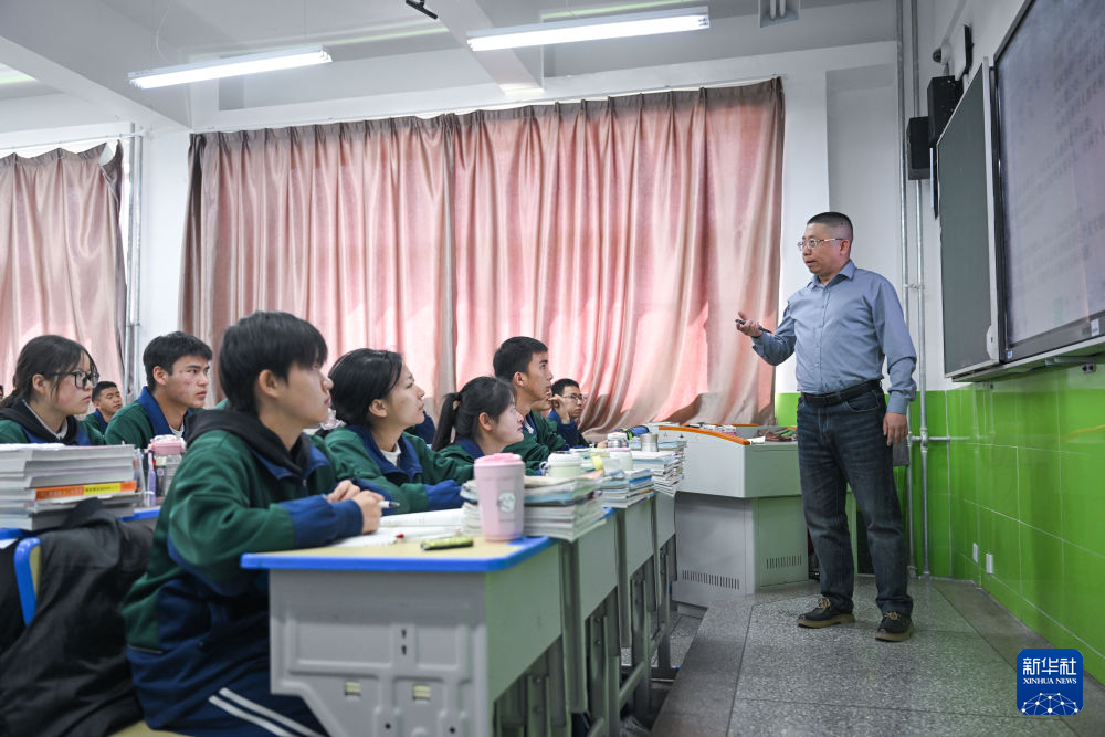 3月31日,在青海省海北藏族自治州门源回族自治县浩门镇高级中学,山东援青教师王程在上课。新华社记者 张龙 摄