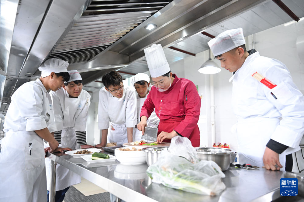3月30日,在青海省海北藏族自治州职业技术学校,山东援青教师王兆红(左四)在指导学生实操。新华社记者 张龙 摄