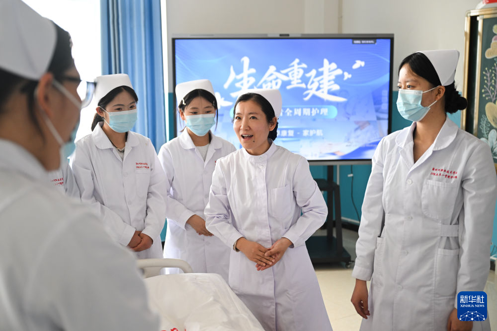 3月30日,在青海省海北藏族自治州职业技术学校,山东援青教师刘芹英(右二)在指导护理专业学生。新华社记者 张龙 摄