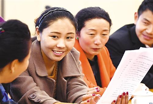 3月7日下午,人大西藏自治区代表团举行全体会议,审议宪法修正案草案。全国人大代表次仁措旦(左二)与其他代表进行交流。 经济日报记者 李景录摄