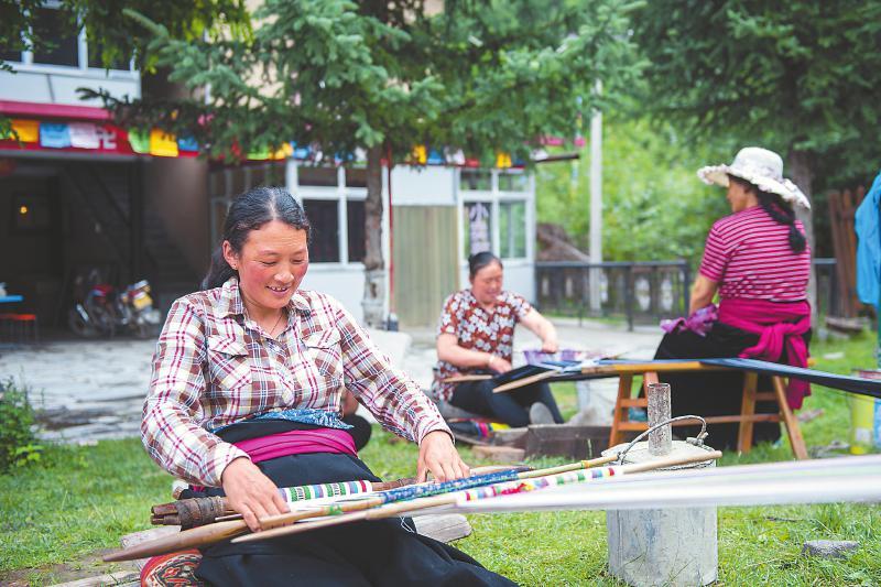 九寨沟县漳扎镇中查村,藏族群众在自家院坝内织布。视觉四川 杨树 摄