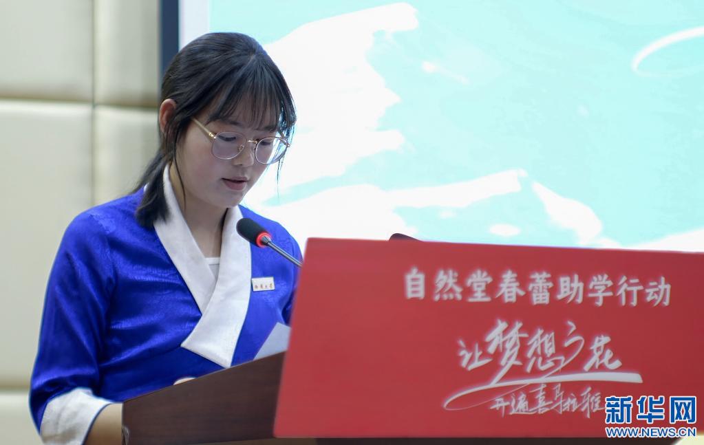 西藏大学2021级汉语言文学班学生德庆旺姆作为受资助学生代表发言时说:“国家和社会的各类资助给我和我的家庭带来很大帮助,真诚感谢伽蓝集团、学校、老师、同学和所有帮助我的人,我会在你们的支持和关爱中懂得感恩,学会去爱。”