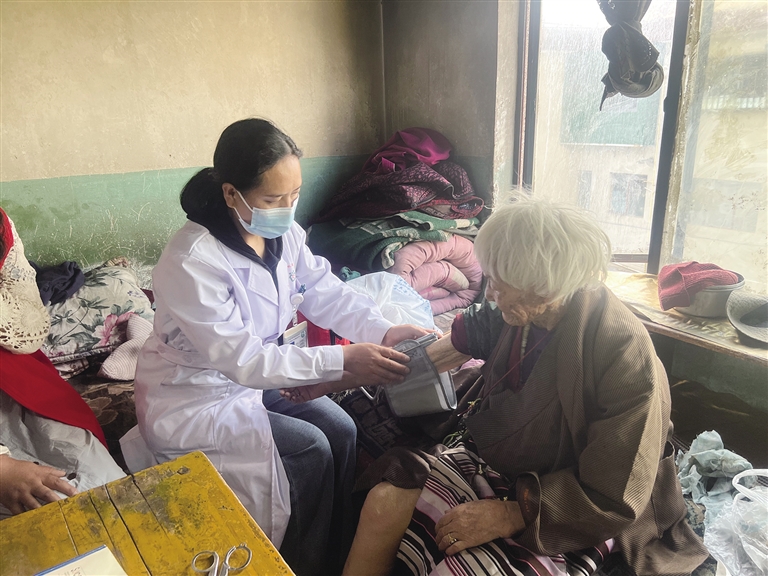 医护人员为独居老人检查身体。