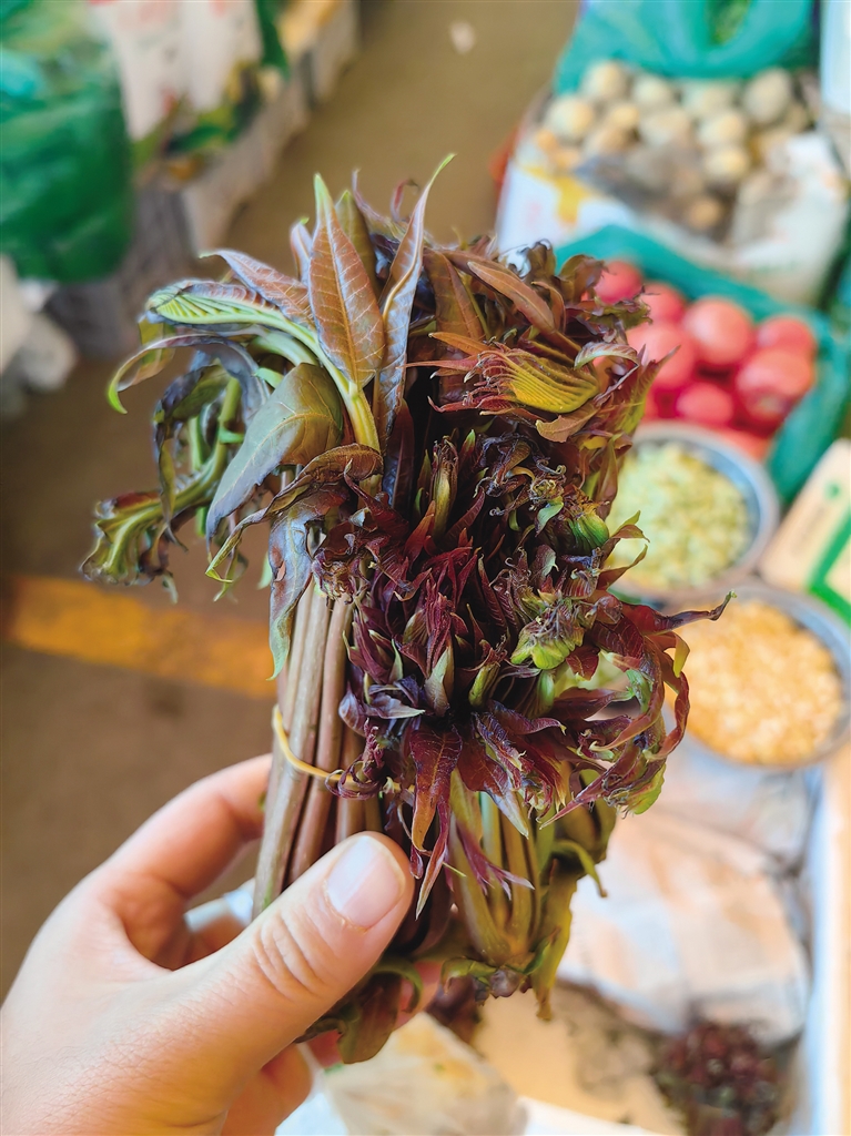 香椿芽堪称是“春天的珍馐”,素有树上蔬菜的美称。“我的老家在河北,每年春天香椿冒芽的时候,都会采摘香椿芽炒着吃,甚至吃不完的香椿芽还会用来做成香椿酱。”张女士说,在菜市场,她看到紫红色的香椿叶,散发出独特的香气,立马想买一点回家炒鸡蛋吃。