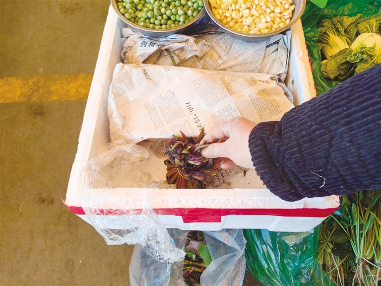 “今天早上卖的香椿芽每斤100元,中午就剩这两把了,降价了,香椿芽每斤80元。”胡阿姨说。随后,张女士购买了两小把香椿芽,共计48元。