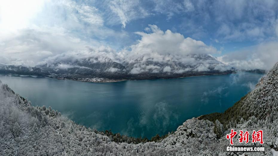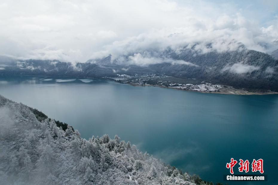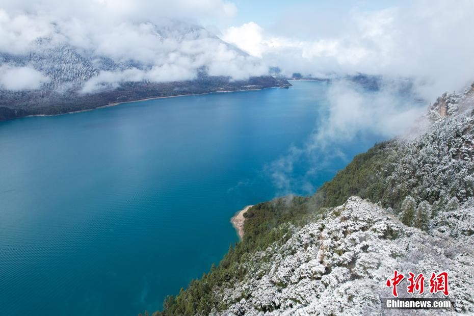 巴松错位于西藏林芝工布江达县境内,地处巴河上游的高山峡谷中,是西藏首个自然风景类国家5A级旅游景区。4月5日,巴松错迎来一场春雪,雪后四周原始森林犹如蒙上洁白面纱,湖面宛如一面蓝宝石镶嵌其中,风光如画。图为4月5日,巴松错与四周的原始森林和雪山风光。中新社记者 江飞波 摄