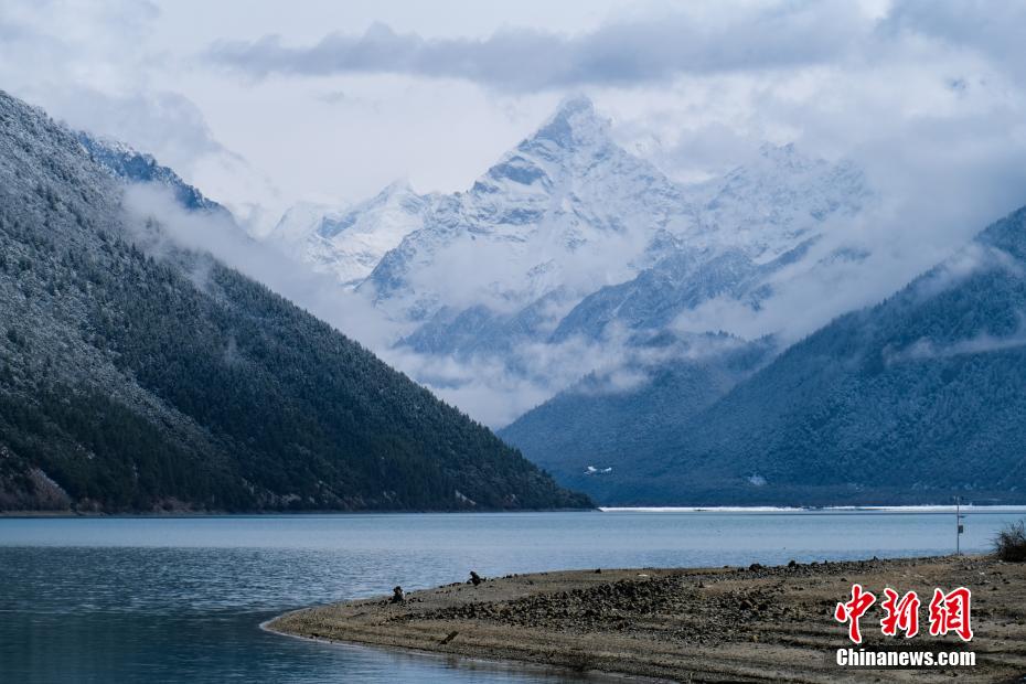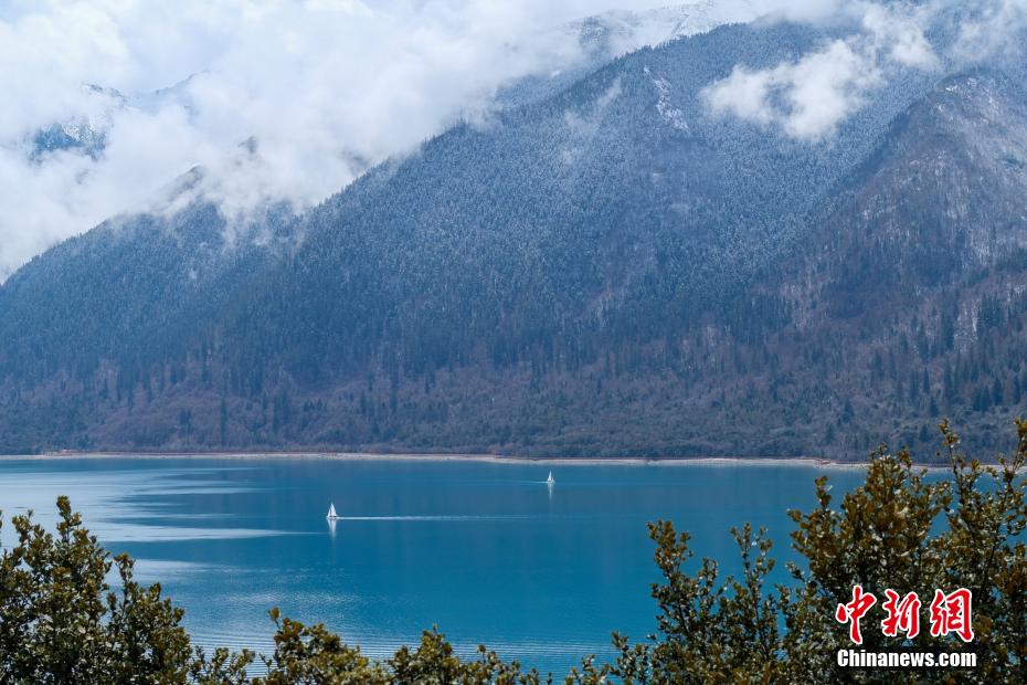 巴松错位于西藏林芝工布江达县境内,地处巴河上游的高山峡谷中,是西藏首个自然风景类国家5A级旅游景区。4月5日,巴松错迎来一场春雪,雪后四周原始森林犹如蒙上洁白面纱,湖面宛如一面蓝宝石镶嵌其中,风光如画。图为4月5日,巴松错与远处的雪山风光。中新社记者 江飞波 摄