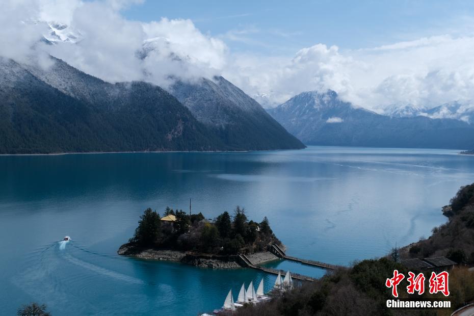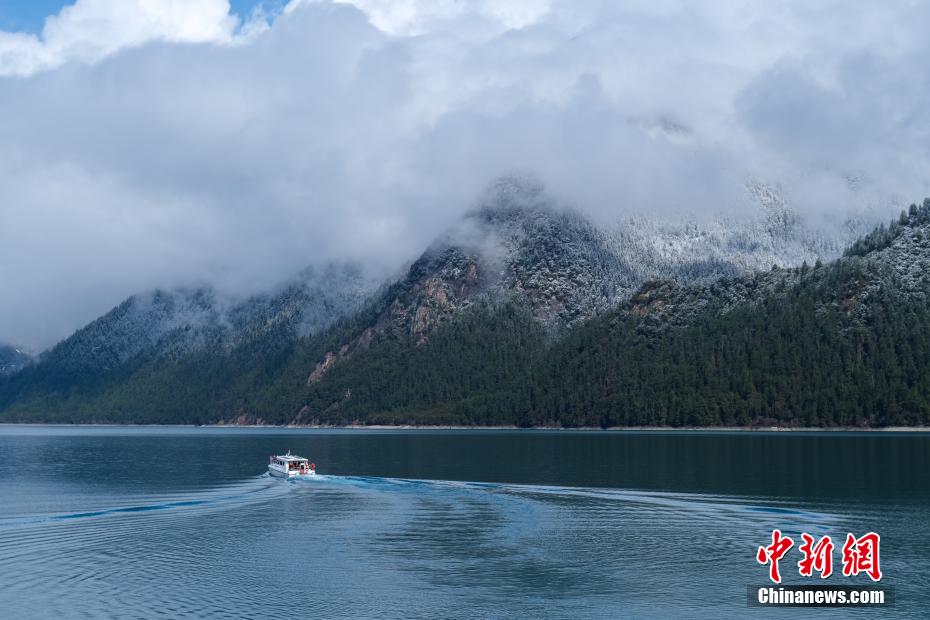 巴松错位于西藏林芝工布江达县境内,地处巴河上游的高山峡谷中,是西藏首个自然风景类国家5A级旅游景区。4月5日,巴松错迎来一场春雪,雪后四周原始森林犹如蒙上洁白面纱,湖面宛如一面蓝宝石镶嵌其中,风光如画。图为4月5日,游客乘船游览巴松错。中新社记者 江飞波 摄