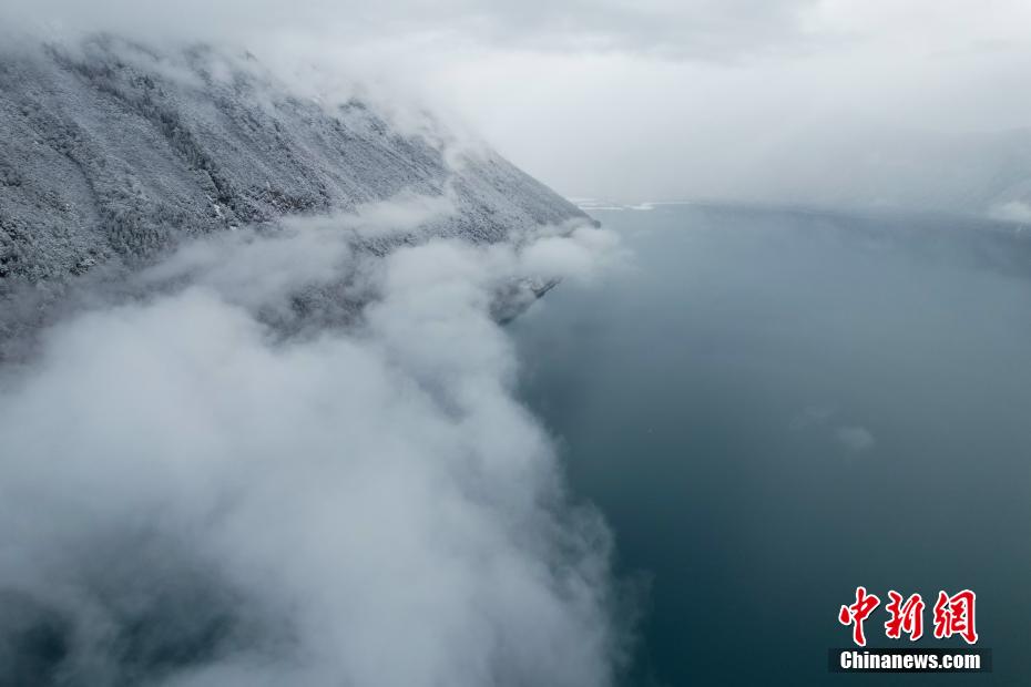 巴松错位于西藏林芝工布江达县境内,地处巴河上游的高山峡谷中,是西藏首个自然风景类国家5A级旅游景区。4月5日,巴松错迎来一场春雪,雪后四周原始森林犹如蒙上洁白面纱,湖面宛如一面蓝宝石镶嵌其中,风光如画。图为4月5日,雪后巴松错四周云雾缭绕,犹如仙境。(无人机画面)中新社记者 江飞波 摄
